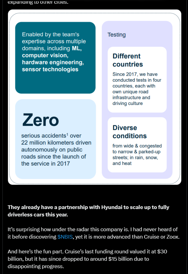 Nebiuksessa on kaksi asiaa, miksi se on kiinnostava. Edellä kerroin jo, että toimitusjohtajan CV (perusti “Venäjän Googlen”) ja hänen osakeomistus yhtiössä on kunnossa. Toinen yhtä merkittävä asia on se, että Ukrainan sodan alettua iso osa Yandexin henkilökuntaa muutti pois kotimaastaan. Erilaisten vaiheiden jälkeen alun perin moskovalaisen Yandex yhtiön toimitusjohtaja ja Yandexin noin tuhat huippuammattilaista työskentelevät nyt Amsterdamissa, Nebius Groupissa. Tässä tapahtui niin, että venäläisen Yandexin ”aivot” siirtyivät Nebiukseen, ja Yandexin pääomat ja IPR:t siirrettiin Venäjälle, niitä ei ole Nebiuksessa.