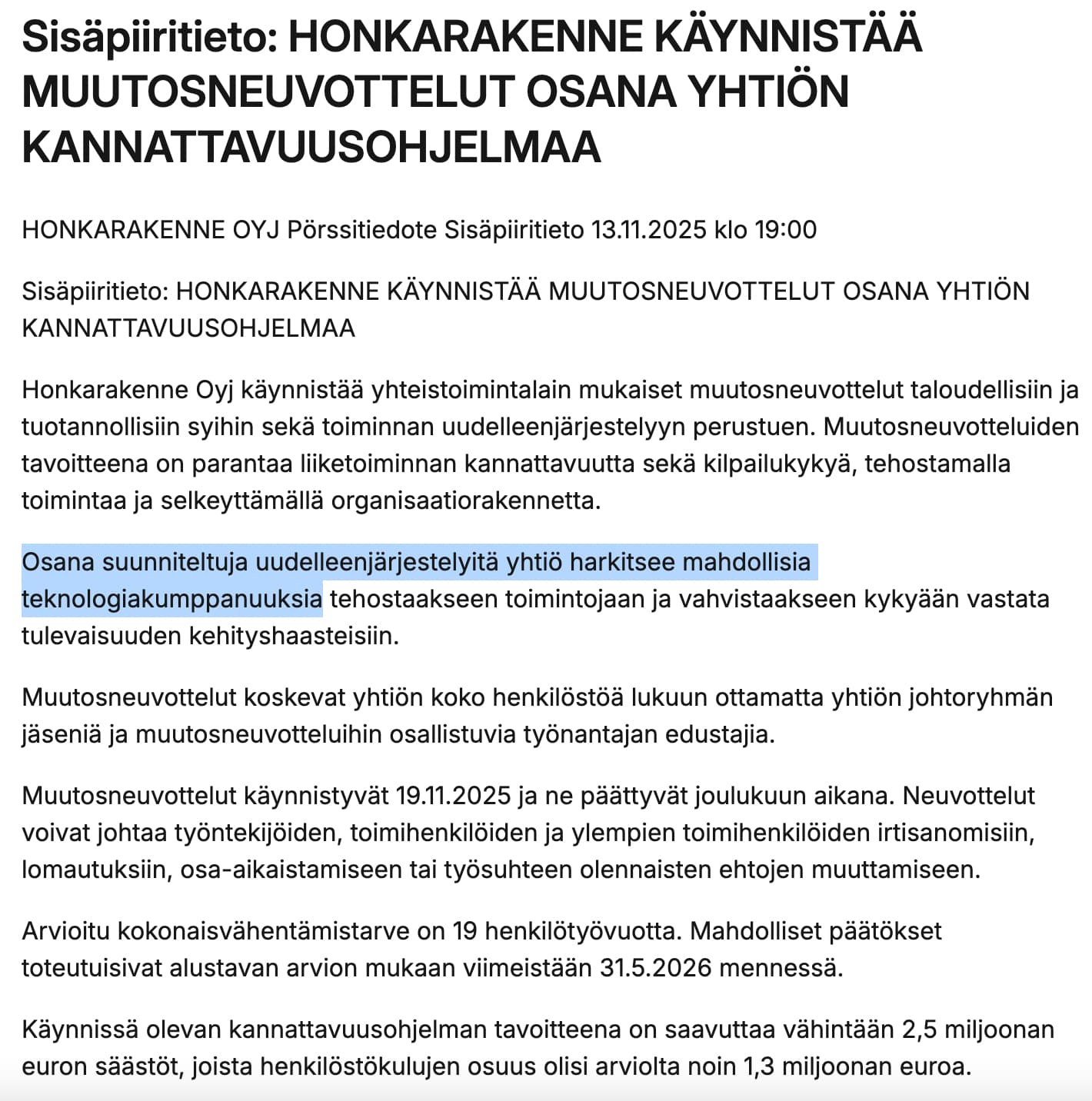 Här är Ates kommentarer även om att Honkarakenne inleder omställningsförhandlingar.