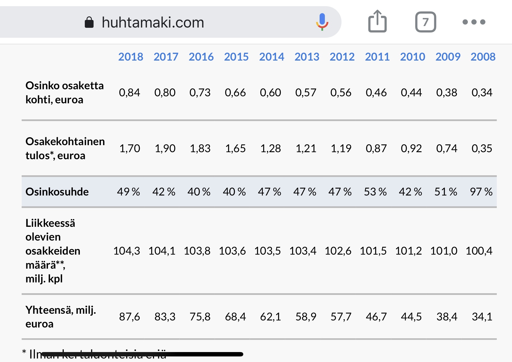 Huhtamäki kuuluu Suomessa myös siihen harvalukuiseen ryhmään, joka enemmän tai vähemmän osaa kasvattaa osinkoaan kestävällä tavalla. Katkeamaton osingonnostoputki nyt yksitoista vuotta, eikä osinkosuhteen perusteella pitäisi olla näköpiirissä vaaraa katkeamiselle. Suomen osinkoaristokraatti.