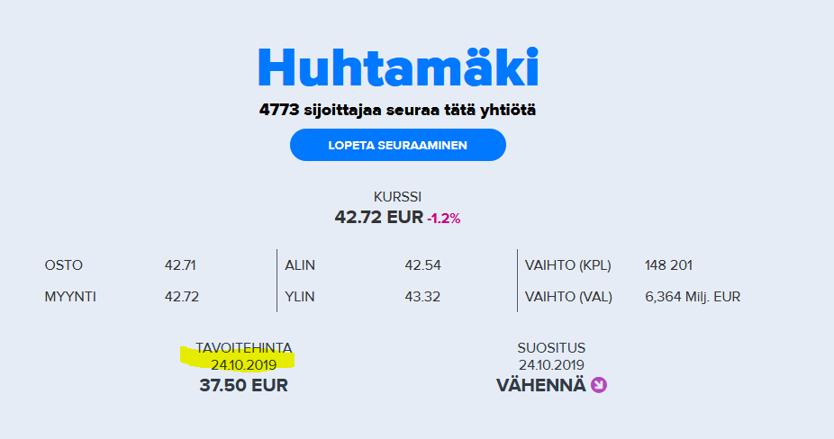 Huhtamäen näkymien poisto oli siinä mielessä poikkeuksellinen, että näkymät on ulkomuistini perusteella kirjattu raportteihin jokseenkin samalla tavalla koko sen ajan mitä olen yhtiötä seurannut eli noin 7 vuotta (huom: tämä kommentti tulee ulkomuistista eikä sitä pidä pitää faktana ilman tarkastamista). Tämä kertoo kuitenkin varmaan jotain siitä, miten korkealla rima näkymien muuttamisen suhteen on Huhtamäessä sekä myös nykyisen tilanteen epäselvyydestä. Osinko meni myös toistaiseksi jäihin.