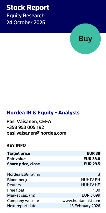 Nordea julkaisi päivitetyn Huhtamäki-analyysinsä Q3-tuloksen jäljiltä. Suositus (OSTA) ja tavoitehinta (38,00 €) pysyvät ennallaan.
