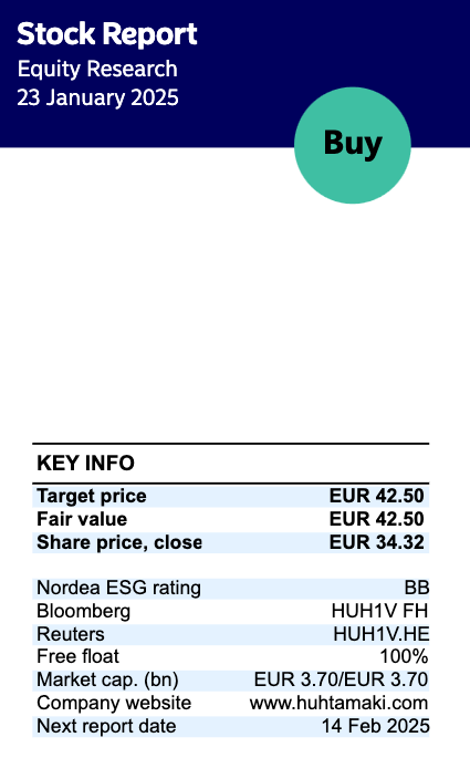 Nordea julkaisi päivitetyn Huhtamäki-analyysinsä. Suositus (OSTA) ja tavoitehinta (42,50 €) pysyvät ennallaan. ![]()