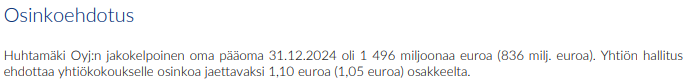 Huhtamäki Oyj:n jakokelpoinen oma pääoma 31.12.2024 oli 1 496 miljoonaa euroa (836 milj. euroa). Yhtiön hallitus ehdottaa yhtiökokoukselle osinkoa jaettavaksi 1,10 euroa (1,05 euroa) osakkeelta.