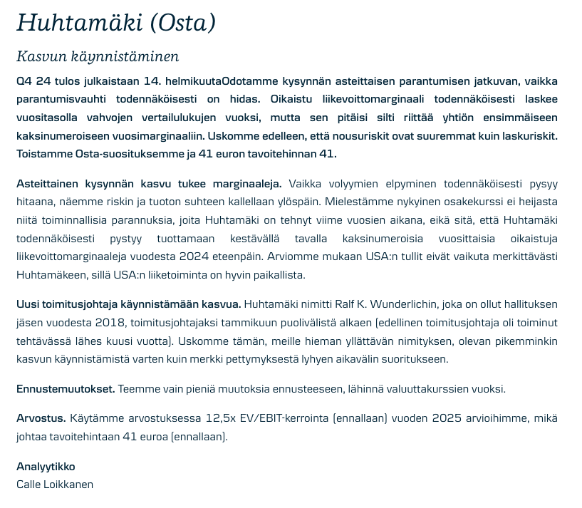 Analyytikon ennakkokommentit Huhtamäen Q4-tuloksesta. ![]()