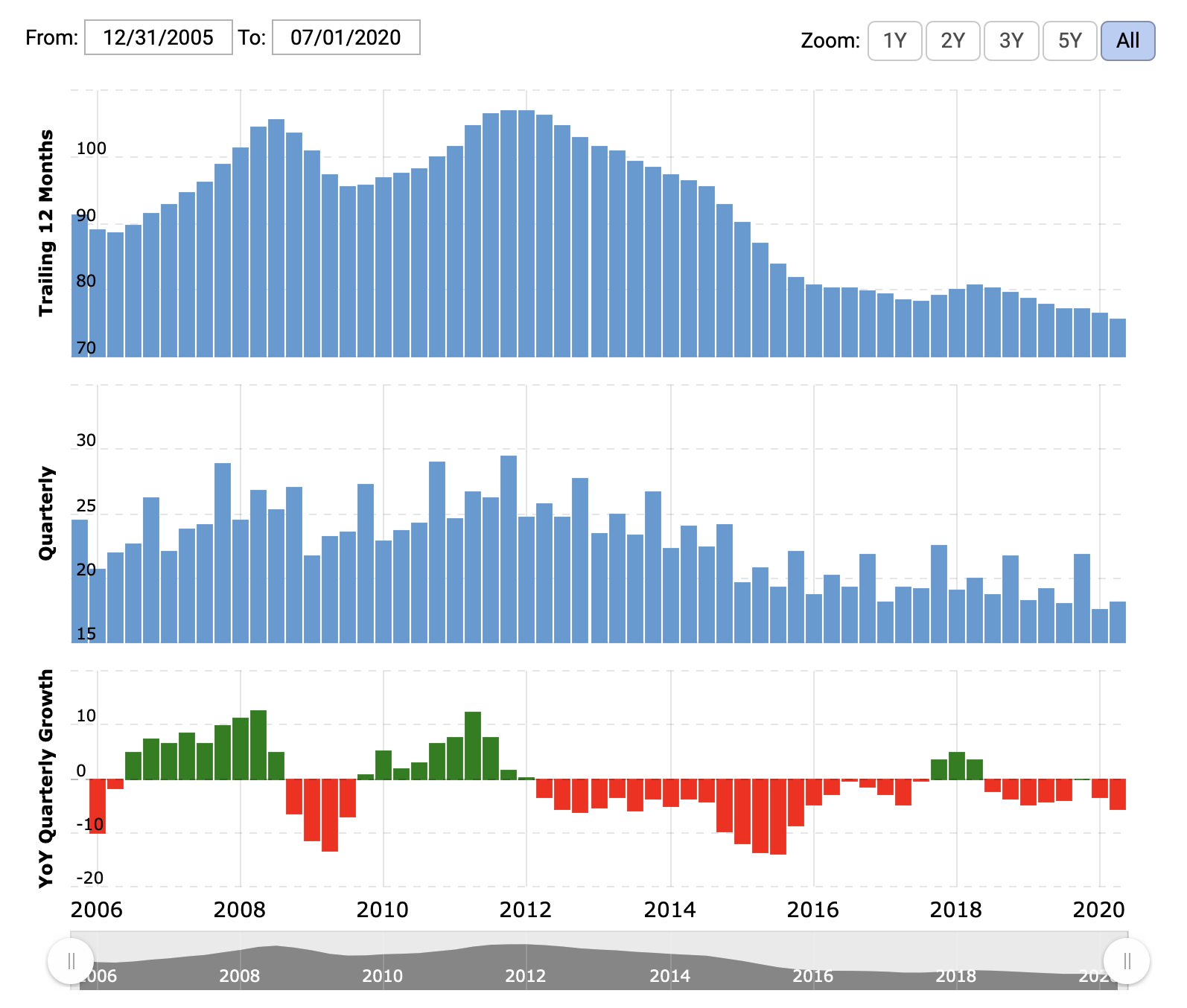 IBM:n Q2-rapsa ei suurta käännettä vielä lupaillut, vaikka sekä liikevaihto että tulos hyvin alhaalle vedetyt konsensusennusteet ylittivätkin. -5.5% liikevaihdon lasku viime vuoden Q2:een jatkaa sitä supistuvan liikevaihdon kierrettä joka alkoi vuonna 2012.