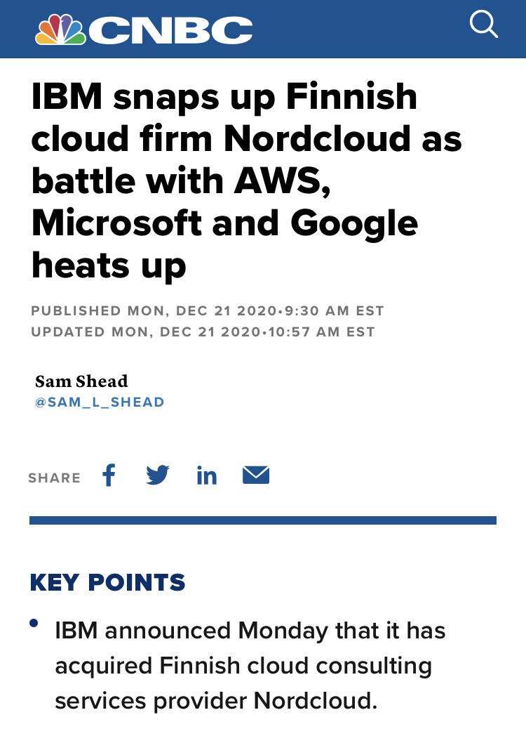 IBM osti historiansa suurimmassa yrityskaupassa pari vuotta sitten RedHatin 34 miljardin taalan hinnalla. Tämän transaktion rahoittamiseksi IBM on velkaantunut rajusti. RedHattia ei integroida osaksi muuta IBM:ää, vaan se toimii itsenäisenä yhtiönä.