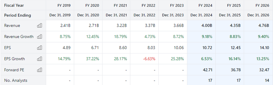 Tällä hetkellä TTM P/E ja P/FCF liikkuu siellä 45 tietämillä, eli kovasti on kasvua ladattu hintaan. Alla muutaman ensi vuoden ennusteita Stock Analysis-sivulta.