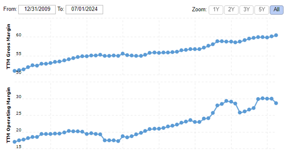 Muutamana muuna poimintana taloudellisista luvuista voisi mainita GM% ~60% ja EBIT% ~30. Liiketoiminta on pääomakevyttä; viimeisen viiden vuoden aikana poistojen osuus operatiivisesta kassavirrasta (eli ajatuksena on, että poistot ovat likimäärin sama kuin ylläpitocapex) on ollut keskimäärin 16% ja vapaata kassavirtaa on syntynyt keskimäärin 17% liikevaihdosta. Velkaa yhtiöllä on melko vähän (Debt/EBITDA=0,82) ja sijoitetun pääoman tuotto noin 30%. Lukujen valossa siis vaikuttaisi, että yhtiöllä on vahvoja kilpailuetuja. Vapaata kassavirtaa sijoitetaan jonkin verran takaisin omaan liiketoimintaan, mutta suurin osa palautetaan omistajille omien osakkeiden ostojen myötä. Osinkoa yhtiö ei ole koskaan maksanut. Vuosiraportin mukaan omien osakkeiden ostojen määrät riippuvat muista investointitarpeista, oman osakkeen hinnasta sekä korkotasosta. Mikä lie johdon oma näkemys osakkeen käyvästä arvosta. Omien ostoissakin saa olla varovainen nyt kun arvostus on korkeahko. Omien ostoilla myös kuitataan osakeperusteisen kannustinjärjestelmien diluutio, joka oli 1,6% liikevaihdosta vuonna 2023.