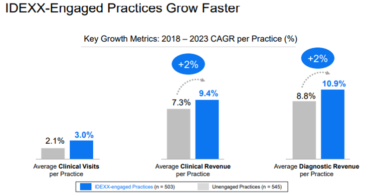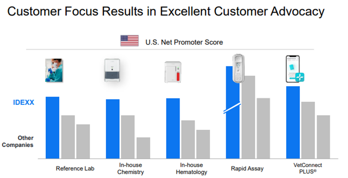 Alla olevissa kuvissa IDEXX mainostaa, että heidän kanssaan yhteistyötä tekevät klinikat kasvavat muita nopeammin. Otos tuossa näyttäisi olevan melko hyvän kokoinen tilastollisen analyysin tekemiseen, mutta täyttääköhän kriteerit sattumanvaraisesta näytteestä ja tärkeämpänä; kertooko tuo korrelaatiosta vai syy/seuraus-suhteesta. Myös IDEXXin ilmoittamat NPS-graafit ovat imartelevia, mutta tuosta toki puuttuu skaala. Eli ottaisin nämä kuvaajat varovaisesti vastaan, mutta ilmeisesti ainakin IDEXX on sitä mieltä, että heillä olevat kilpailuedut näkyvät näissä tuloksissa.