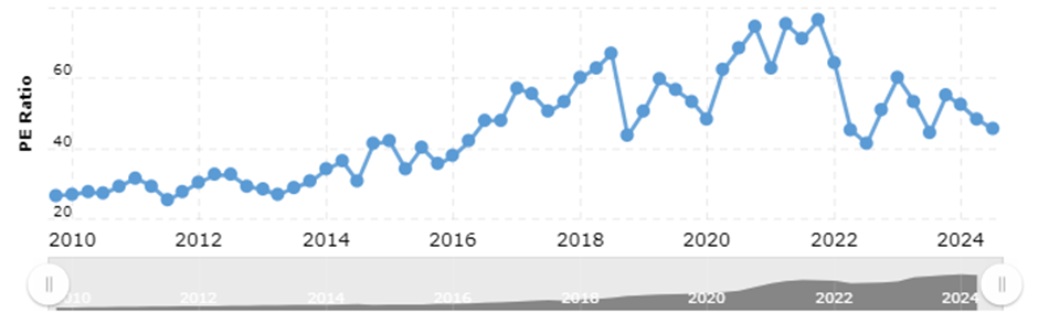 P/E-kerroin on lähtenyt kovaan nousuun 2014 tienoilla ja ollut siitä koholla jo viimeiset seitsemän vuotta eli lienee aika unohtaa ostokset P/E 30-tasoilta ellei yhtiössä tapahdu merkittävää käännöstä heikompaan suuntaan. Viimeiseen viiteen vuoteen suhteutettuna osaketta voisi jopa pitää edullisena tai kohtuu hintaisena. Kaksinumeroinen vuosituotto vaatisi kyllä todella kovaa kasvua jatkossakin.