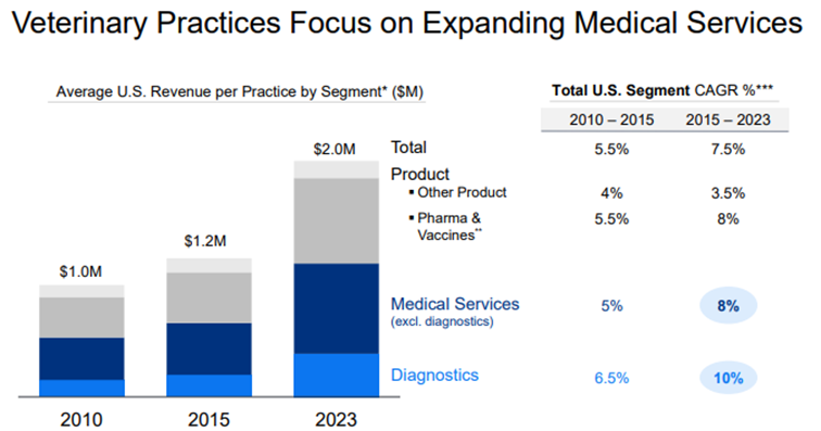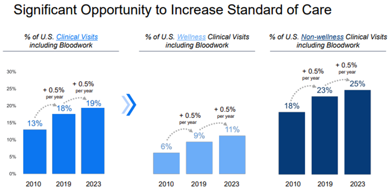 Sijoittajapäivillä oli myös mielenkiintoinen kalvo siitä, miten verikokeiden määrä suhteutettuna eläinlääkärikäynteihin on lisääntynyt viimeisen ~15 vuoden aikana ja kuinka diagnostiikkapuoli on ollut se vahvimmin kasvava alue eläinlääkäriklinikoiden liikevaihdosta.