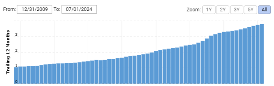 Liikevaihtohistoria on kyllä äärimmäisen seesteinen; harvalla yrityksellä myynti sen kuin kasvaa vuodesta toiseen näinkin tasaisesti. Vuodesta 2010 lähtien Q2 2024 saakka TTM liikevaihto on kasvanut 8,8% vuodessa. EPS ei sentään ole kasvanut yhtä tasaisesti, mutta vuosikasvu samalla ajanjaksolla sitäkin näyttävämpi 15,9%.