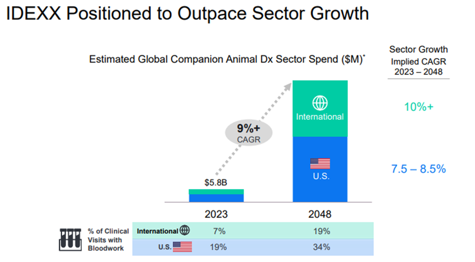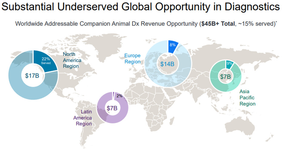 Yhtiön näkemyksen mukaan markkinalla on otettavaa tulevaisuudessa vielä mielin määrin. Alla oleva kuva on IDEXXin 2024 sijoittapäivältä. No nämä sijoittapäivähypetykset kannattanee aina ottaa hieman suolan kanssa, mutta uskon kyllä, että markkina tulee kasvamaan mukavaa tahtia. Ihmisten syntyvyyden ollessa laskusuhdanteessa ainakin kehittyneemmissä maissa tullaan tulevaisuudessa oletettavasti näkemään tasaiseen tahtiin enemmän lemmikinomistajia (oma arvaukseni) ja näiden hyvinvointiin panostetaan enemmän.