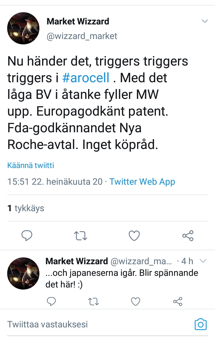 Koko historia liittyy tähän samaan tuotteeseen eli TK1-analyysiin käyttäen TK 210 ELISA -testiä. Kaikki tulokset tähän asti ovat olleet vahvasti positiivisia ja yleispätevälle, hyvin aikaisessa vaiheessa tuloksen antavalle syöpätestille on valtavasti kysyntää. Lisäksi AroCell olisi ensimmäinen markkinoilla, jolloin voivat pitkälti itse määrittää hinnan. Eli kun vahva pohjatyö on nyt valmis (ja ilmeisesti laajentavat jo uusiin johdannaistutkimuksiin), niin FDA-hyväksynnän jälkeen (loppuvuosi 2020 / Q1 2021) on odotettavissa kovaa nousua.
