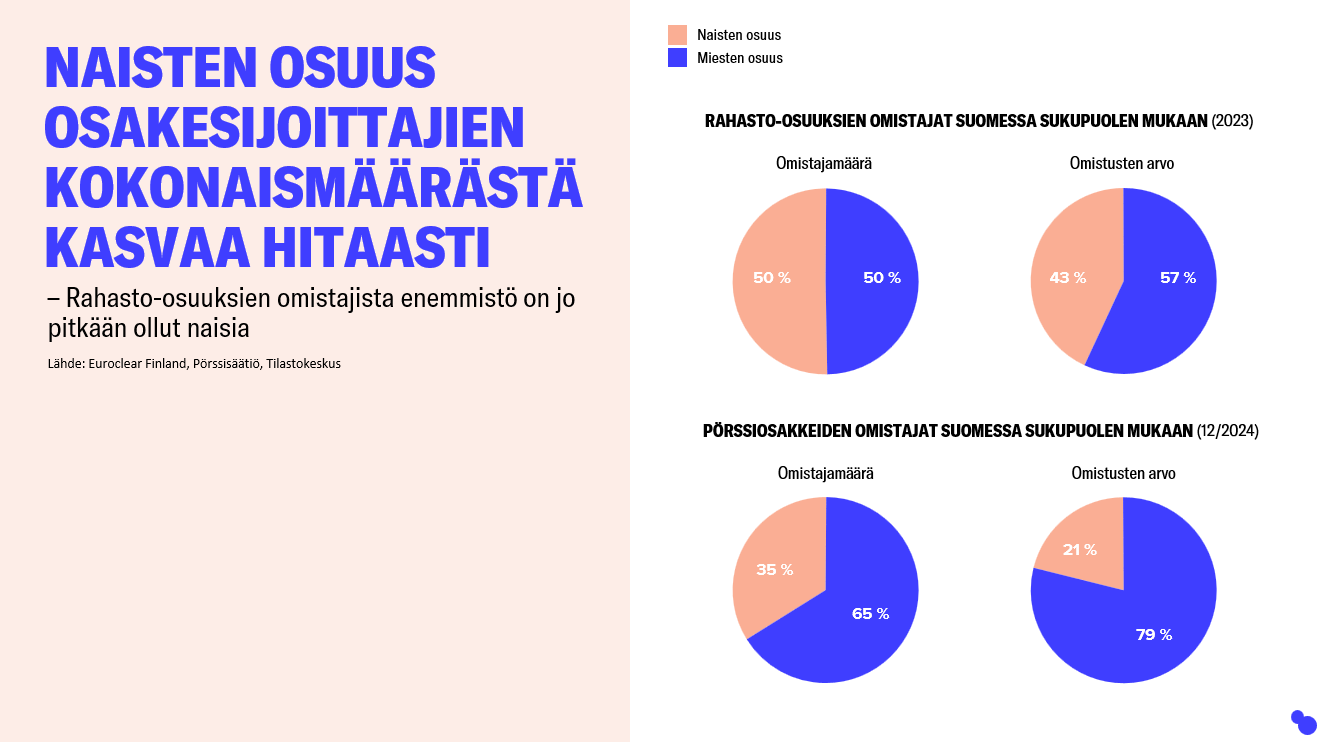 Niin kuin @Marianne_Palmu aiemmin totesikin, me naiset olemme kuitenkin aliedustettuja osakemarkkinoilla (ainakin vielä toistaiseksi). Nimittäin tutkimusten mukaan naisten osuus osakesijoittajista on pysynyt noin kolmanneksessa (12/2024: ~35%) viimeisen vuosikymmenen aikana, vaikka osakesijoittajien määrä kokonaisuudessaan on kasvanut vauhdilla.