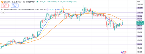 On daily candles, BTC has risen above the fastest moving averages (EMA9, EMA15, and SMA20). The nearest resistance level is found at SMA50 around $90,000. If BTC breaks above it, I would see it turning into an uptrend in the short term.