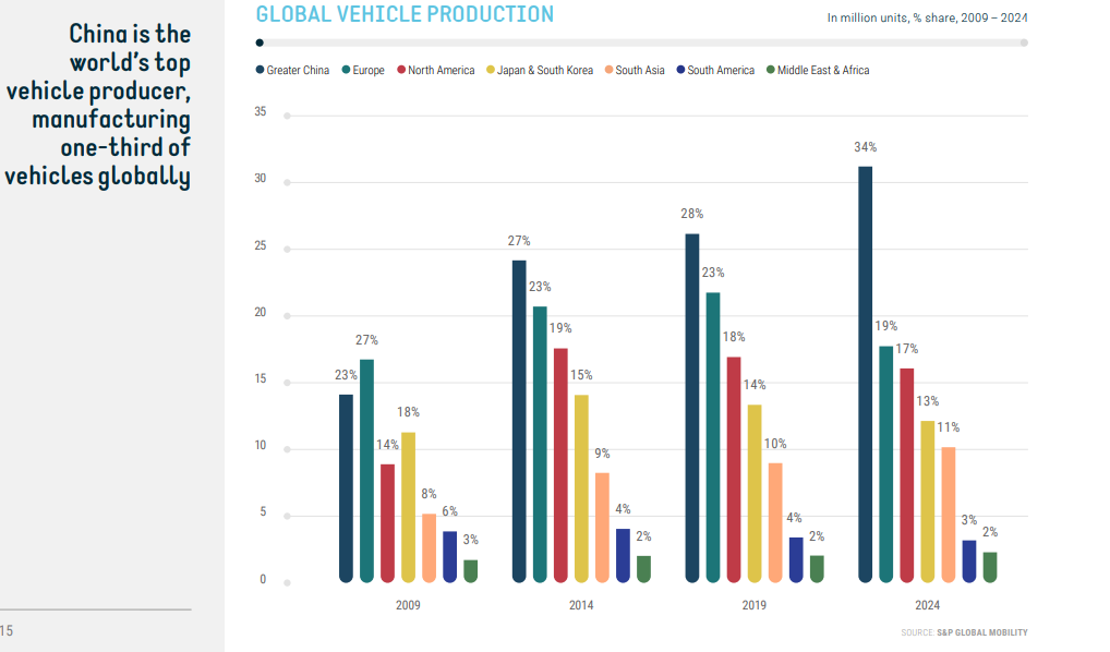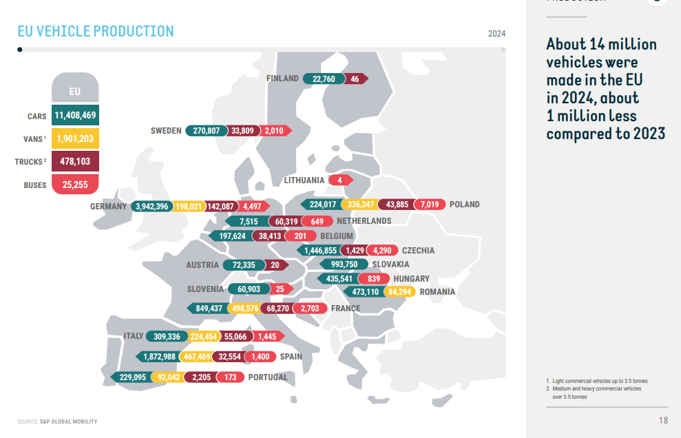 Moikka, ja kiitos oivasta kysymyksestä. Saksan autoteollisuus on etenkin merkittävä työllistäjä (n. 800 000 työpaikkaa autoteollisuudessa), ja sen osuus BKT:sta on 4-5 %, osuus teollisuustuotannosta 20 %. Alla oleva, ACEA:n sivuilta poimittu kuvio havainnollistaa autoteollisuuden vaikeuksia: viime vuonna EU:ssa tuotettiin miljoona autoa vähemmän kuin 2023, ja valtaosa autojen tuotannostahan tulee Saksasta. Samalla Kiina on rohmunnut markkinaosuuksia Saksalta ja muilta EU-valmistajilta viime vuosina. Tämä on osaltaan heijastunut Saksassa työttömyysasteeseen, jonka on noussut viime aikoina, mutta on edelleen euroalueen keskiarvon alapuolella.