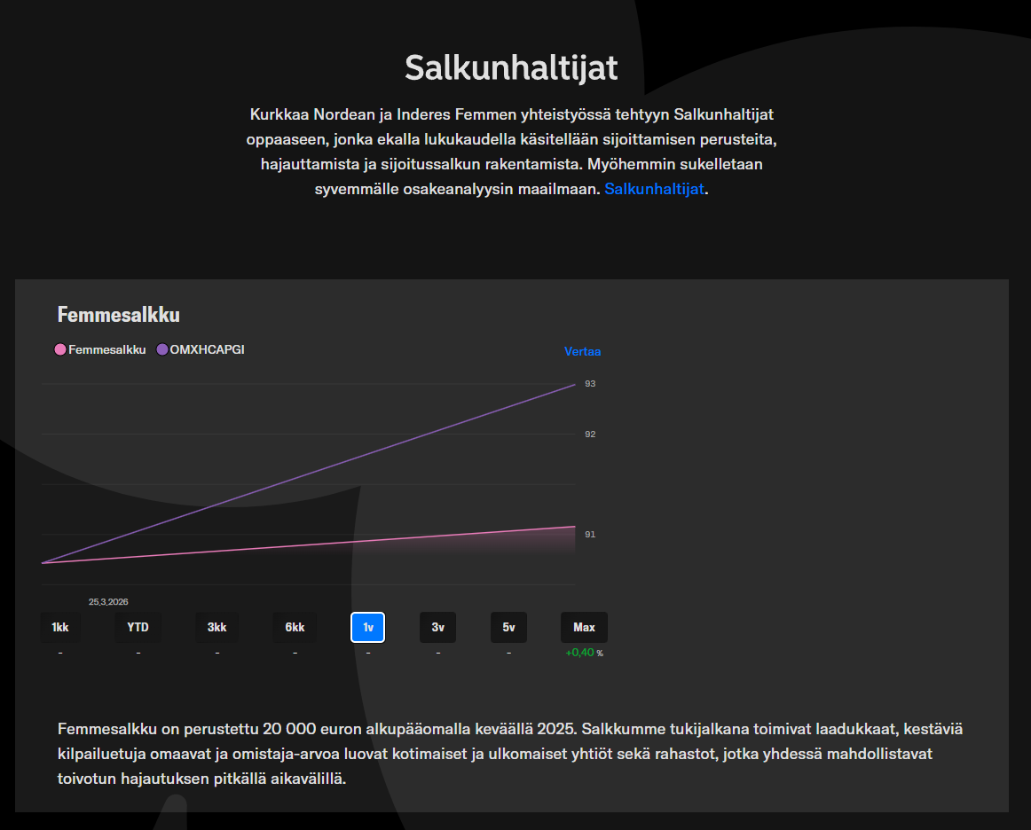 Onko tarkoitus, että tuo käyrä laitetaan näkymään ihan salkun avauksesta lähtien (kevät 2025) niin helpompi pysyä matkassa mukana? Nyt näkyy vain parilta päivältä. Jos yhtään olen oikeassa, taitaa myös Femmen salkkuun osunut pahasti viimeaikojen pörssiheikkous!