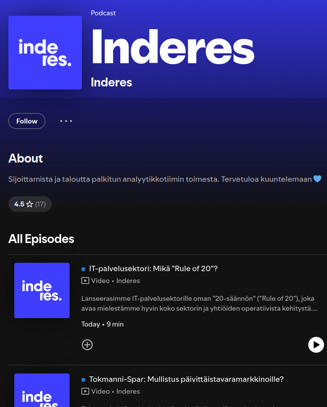 Would it be possible to get this channel, found on Spotify, also on Apple Podcasts? InderesPodi, Raharadio, and Talouden jäljillä seem to be there already.