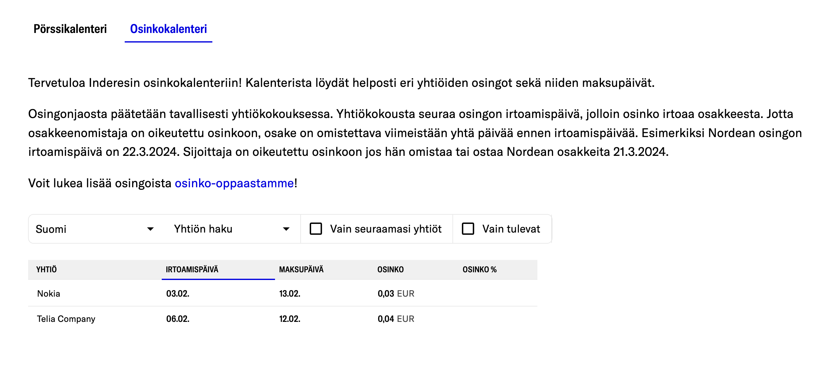 Thanks for the feedback @OsakePaisti! The dividend calendar shows the companies’ announced future dividends, and in January, companies have not yet announced their results for the last financial year, and thus no dividend distribution either. So, dividend dates for the spring should appear there as companies announce their results. Or did you notice anything specific missing from there?