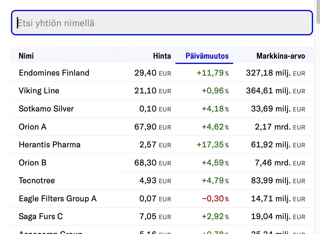 Hvorfor mon denne kursliste ikke sorterer korrekt efter daglig ændring fra største til mindste, hvis man ikke skriver så meget som ét tegn i søgefeltet? Den virker altså, hvis man skriver bare ét tegn i det. Ligeledes, hvis man sorterer fra mindste til største eller bruger Navn eller Markedsværdi.