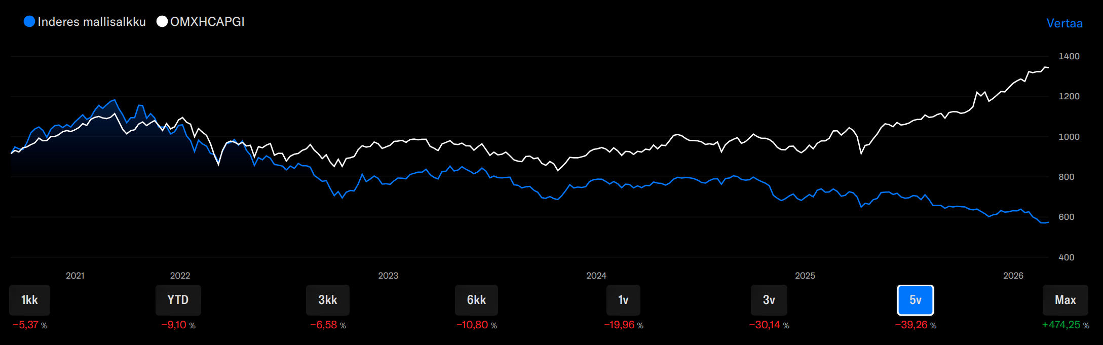 Päivitimme tosiaan mallisalkun käyttämään samaa graafikomponenttia kuin yhtiösivuilla, eli nyt voi tarkastella entistä laajemmin salkun tuottoa / tappiota.