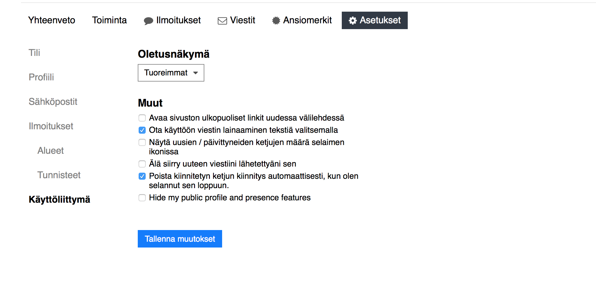 Omiin asetuksiin ja sieltä käyttöliittymä ja painat käyttöön “Avaa sivuston ulkopuoliset linkit uudessa välilehdessä” PING @gravytrainer @evolove173 Jo rekisteröityneet käyttäjät joutuvat tekemään tämän asetuksen itse, mutta foorumin uusille käyttäjille tämä asetus on nyt laitettu vakiona päälle.