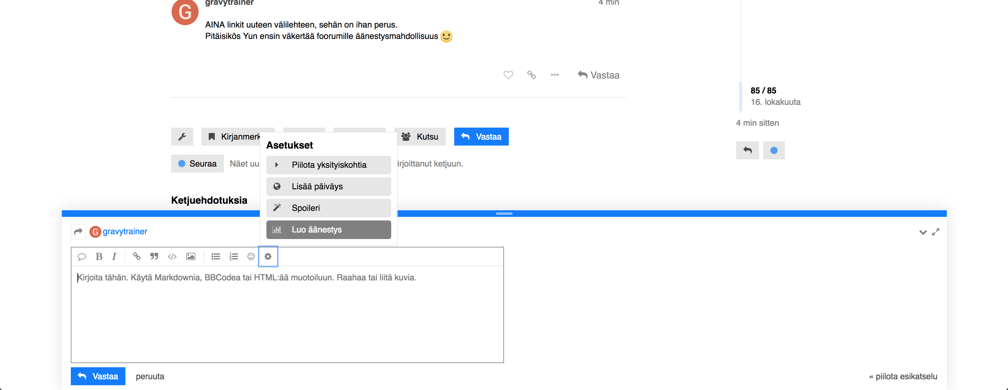 Äänestyksiä / polleja voi tehdä tällä työkalulla @gravytrainer. Eli ton mutterin sisällä on toi Luo äänestys.