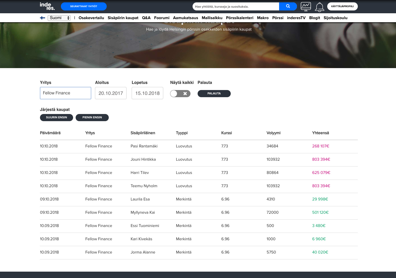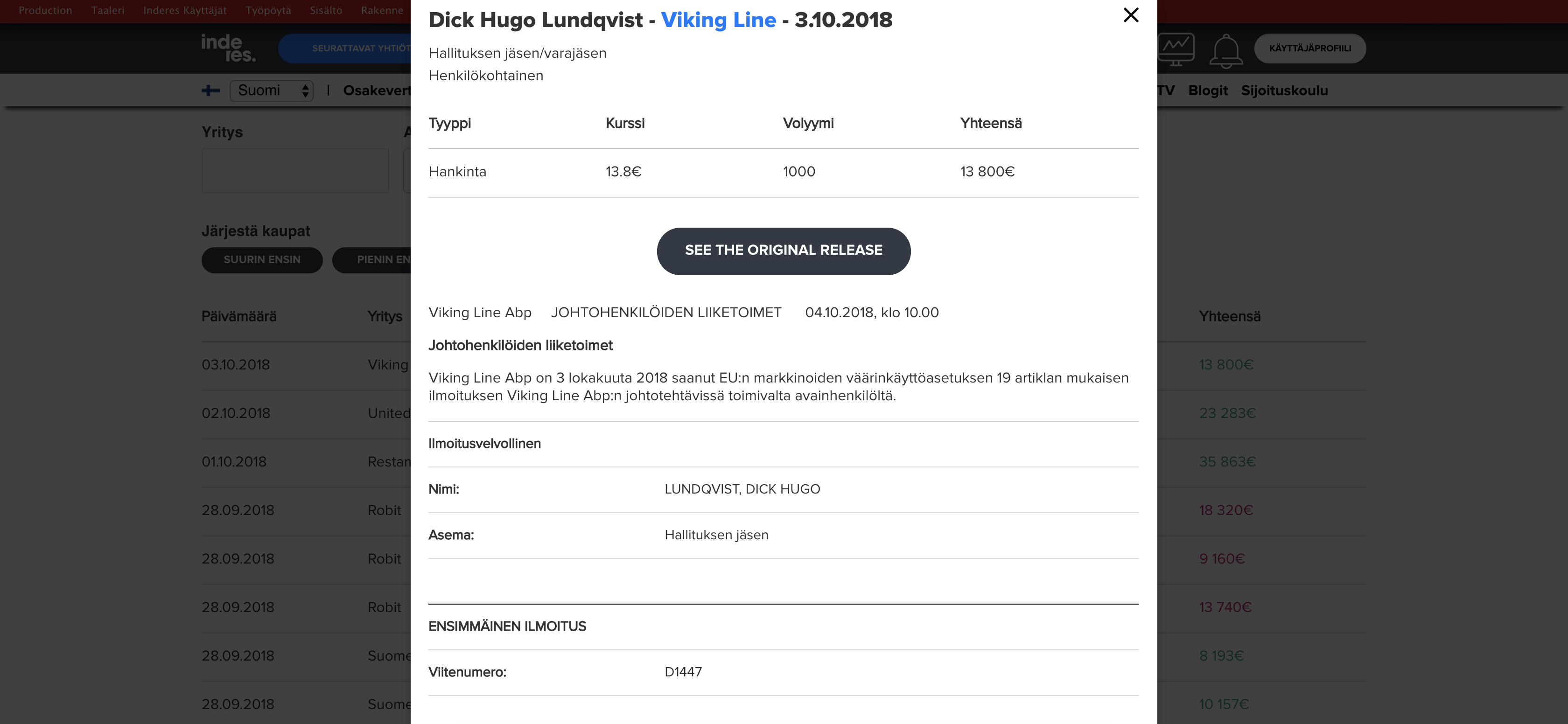 Tehty muutos myös sisäpiirin kauppoihin. Eli nyt voi avata helposti alkuperäisen tiedotteen kun selailee kauppoja. ![]()