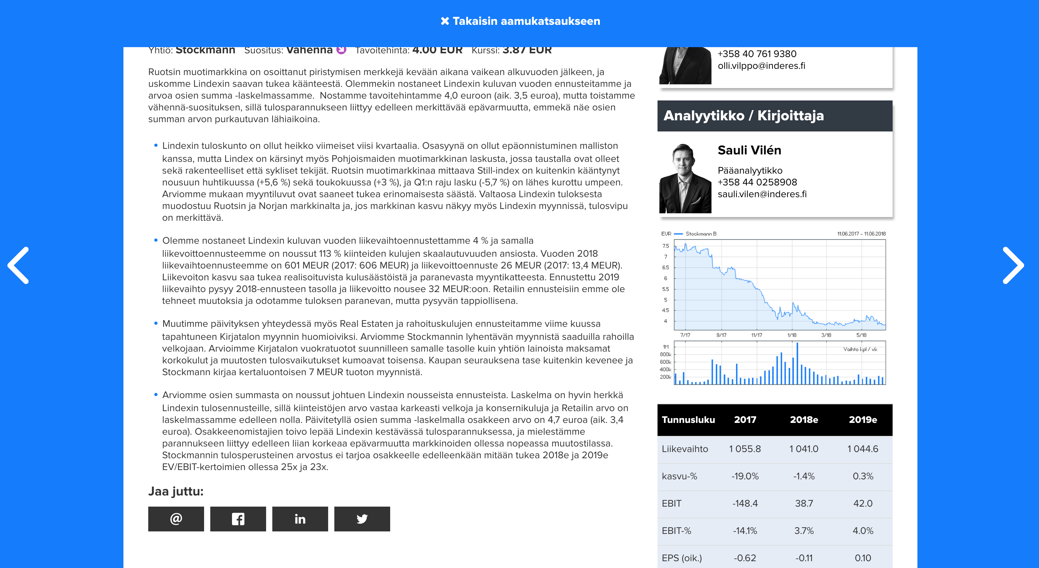 Pieni, mutta sujuvoittava lisä: Osakevertailuun sellainen “palaa ylös” klikattava, ja mahdollisuus vaihtaa yläpalkin valintaa ollessaan osakkeen kohdalla, niin ei tarttee aina scrollailla ees taas. Eli jos katson “tunnuslukuja” ja olen Sampon kohdalle scrollaillut, voisin siinä kohdalla suoraan vaihtaa toiset luvut (esim. “suositukset”) näkyviin ja näkymä pysyisi Sampon kohdalla, eikä hyppäisi taas listan alkuun.