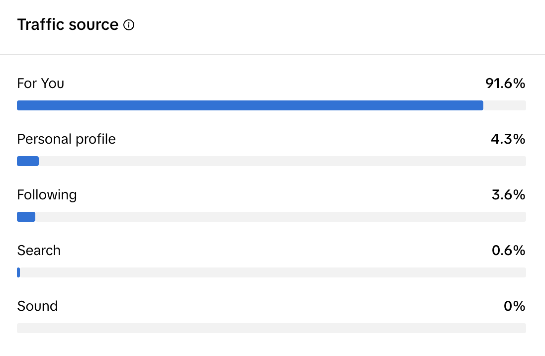 Tässä on esimerkki meidän TikTokin liikenteen lähtiestä. “For you” on mitä algoritmi heittää eteenne feedissä. Katseluista 92 % on tullut sieltä viime aikoina.