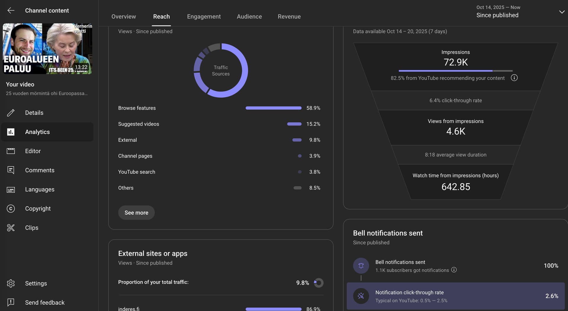 Huom. Youtuben tyypillinen notifkaatioiden klikkaus-% on… 0,5-2,5 %! ![]()