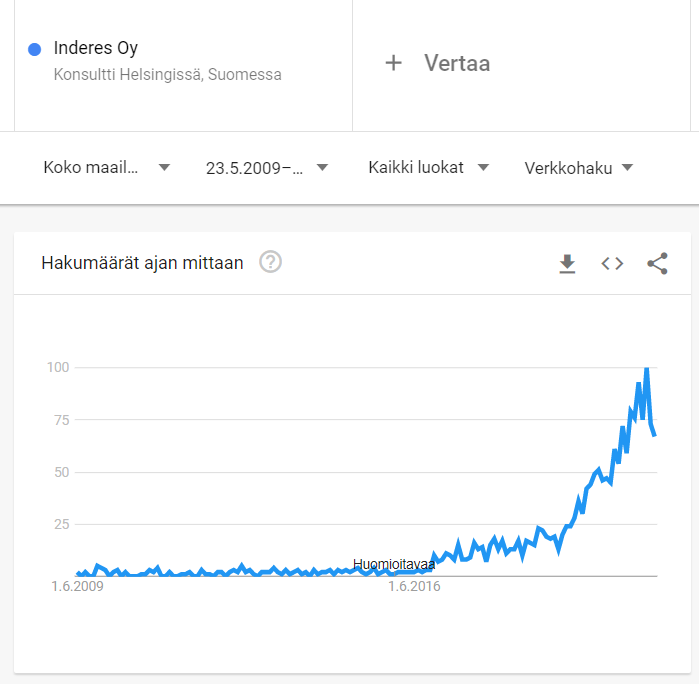 Inderesin suosio näkyy myös trendsin puolella - ohessa trends-käyrä perustamisvuodesta 2009. Laukalle hakutermin suosio on lähtenyt vuoden 2016 lokakuusta ->.