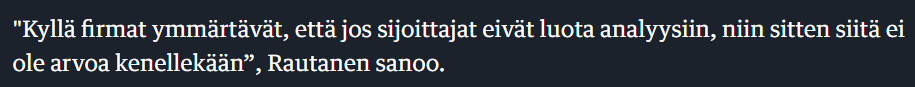 There seems to be a fairly broad and long-standing consensus, at least at the community level, regarding the quality of the analysis. Vepu even conducted a poll about this in the âcoffee roomâ at some point (which I couldnât find to link here anymore). So, as a topic, this isnât a new point. The erosion of the analysis side isnât particularly surprising in itself, given that they are still operating with the same formulas and Excel models as before. The field could have been developed, but as @Pohjolan_Eka already commented, the analysis doesnât bring a single extra euro into the companyâs coffers once the target company has purchased the analysis service. The quality of the analysis has also been discussed here for a long time, so Iâll leave it at that.