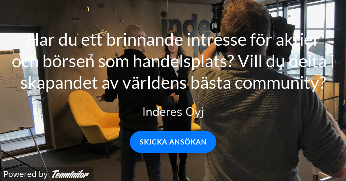 Etsimme uutta yhteisönrakentajaa osa-aikaiseen työsuhteeseen. Tehtävässä tulet työskentelemään läheisesti Inderesin osakeanalyysiin ja sijoittamiseen liittyvän sisällöntuotannon parissa.
