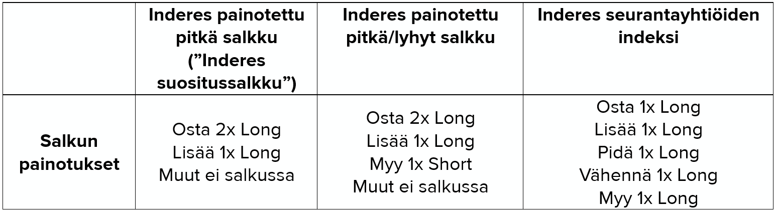 Muodostamiemme salkkujen arvonmuutokset lasketaan siten, että sen osakkeiden painotukset on tasapainotettu päivittäin, ja salkun oletetaan olevan aina kokonaan sijoitettuna. Käytännössä salkut elävät osakkeiden liikkeiden mukana, joten kyseessä on yksinkertaistus. Inderes kuitenkin päivittää suosituksia usein (2013–2024: 100–300 suositusmuutosta vuodessa), joten oletamme salkun tasapainotuksen tapahtuvan aina kun salkkuun vaikuttava suositusmuutos tapahtuu. Laskelma ei huomioi valuuttakurssimuutoksia.