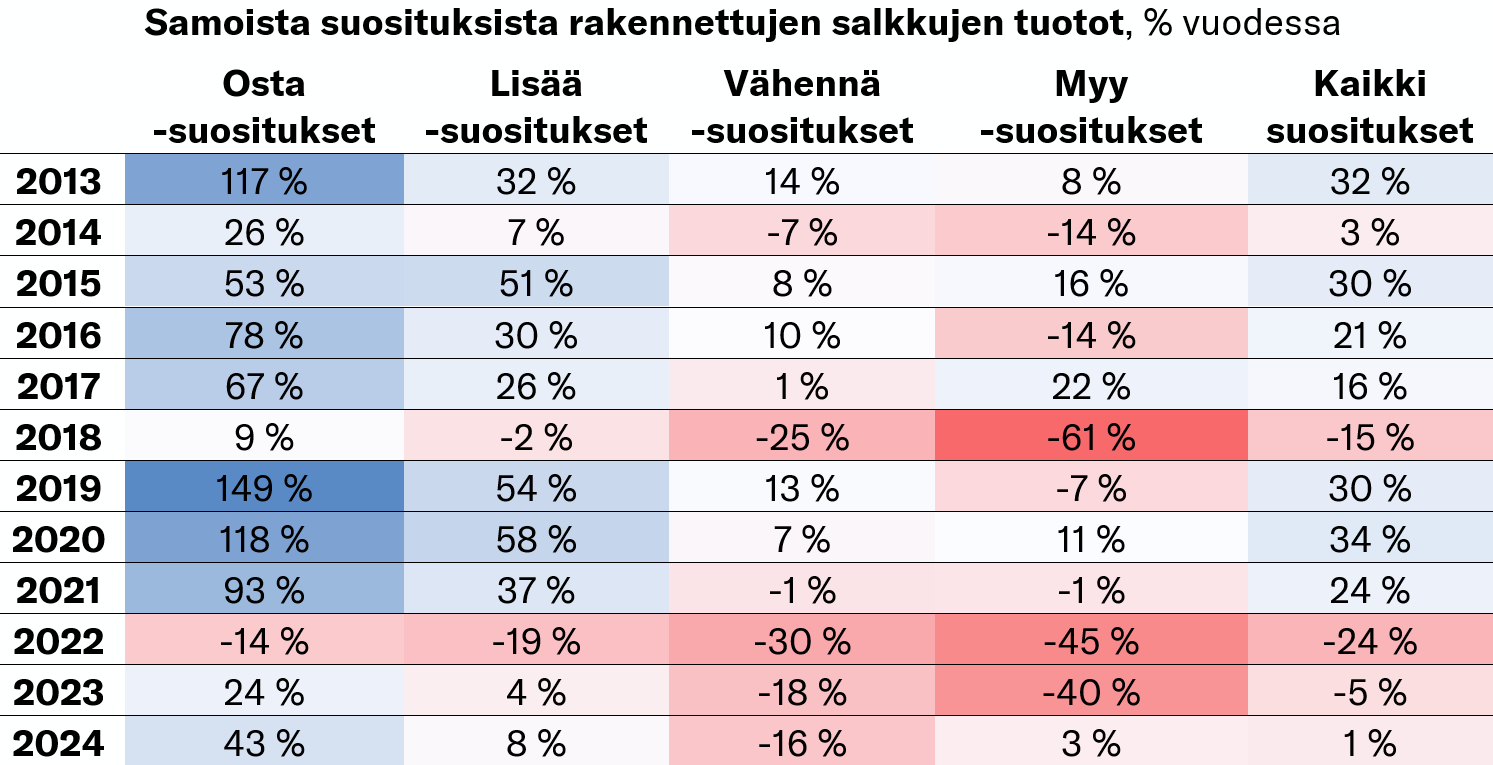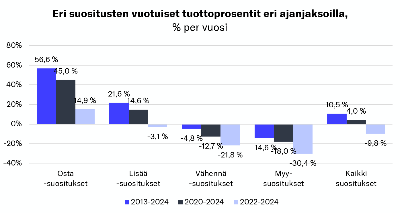 Pidemmän ajan yli suositusten tuotot ovat olleet linjassa, sillä tuottojen suuruus on laskenut portaittain suositusten mukana (Osta > Lisää > Vähennä > Myy). Samalla kaikki tuotot suosituksesta riippumatta ovat olleet matalammat viime vuosina, mikä on linjassa kaikkien seurantayhtiöiden heikompiin tuottoihin tänä aikana. Vuodet eivät myöskään ole veljiä, ja toisina vuosina tuotot ovat paremmin linjassa keskenään. Erityinen häpeäpilkku suosituksissa on vuosi 2022, jolloin myös Osta- ja Lisää-suositusten osakkeet tuottivat tappiota, vaikkakin koko seurannan indeksituottoa (-24 %) vähemmän.