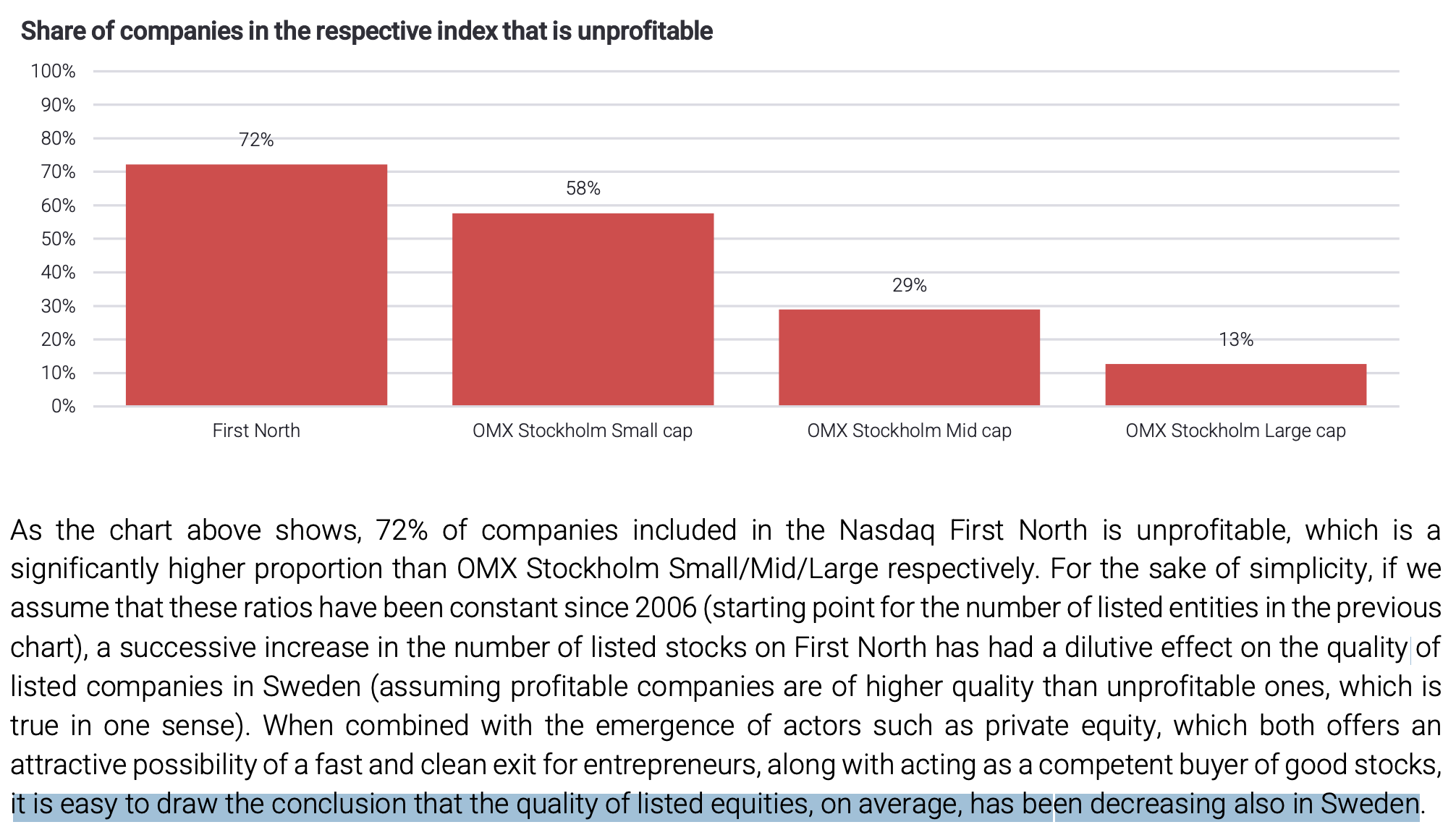 Redeye har direkte sagt, at selskabernes niveau er faldet, og antallet af tabsgivende selskaber er steget relativt. Dette er naturligvis et problem, da det er sværere at analysere tabsgivende selskaber.