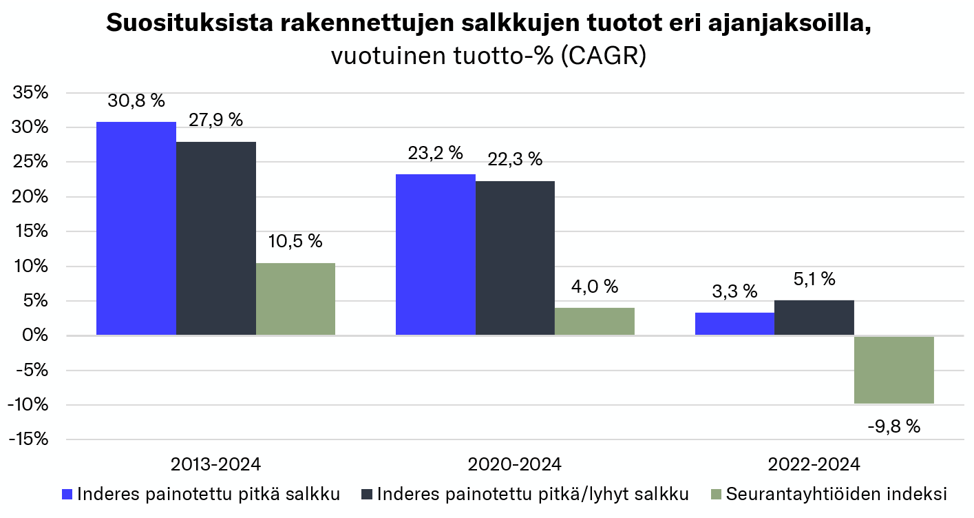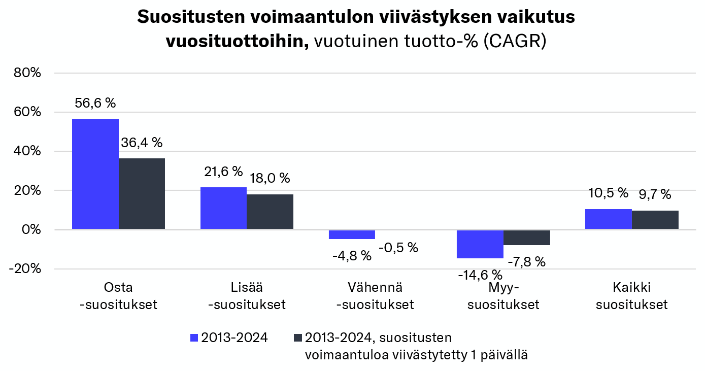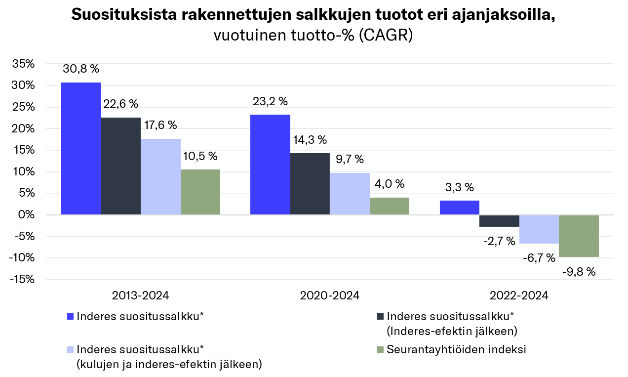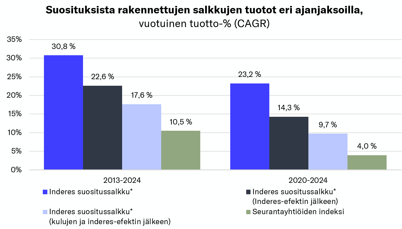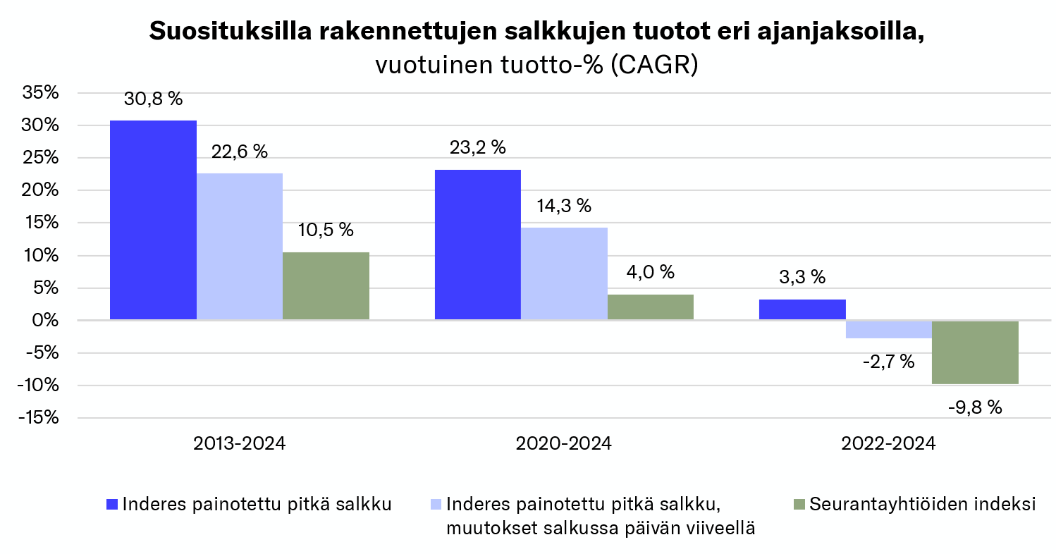 Analysoimamme datan valossa Inderesin osakeanalyysin Osta- ja Lisää -suosituksista rakennettu painotettu salkku on pitkällä (2013–2024) ja keskipitkällä (2020–2024) jaksolla tuottanut 30,8 % ja 23,2 % vuodessa (CAGR) osingot huomioiden. Kun salkun suosituksiin reagointia siirretään päivällä eteenpäin (kaupankäynti suositusmuutoksen jälkeisen ”Inderes-efektin” jälkeen), vuosituotot ovat 22,6 % ja 14,3 %. Kun tähän vielä lisätään oletukset kaupankäynnin kuluista (1 % per kauppa), ovat vuosittaiset tuotot 17,6 % ja 9,7 %. Samoilla ajanjaksoilla kaikkia Inderesin seurantayhtiöitä omistamalla vastaavat vuosittaiset tuotot olisivat olleet 10,5 % ja 4,0 %, mitkä kaikki edellä mainitut Inderesin suosituksista rakennetut salkut ovat ylittäneet selvästi.