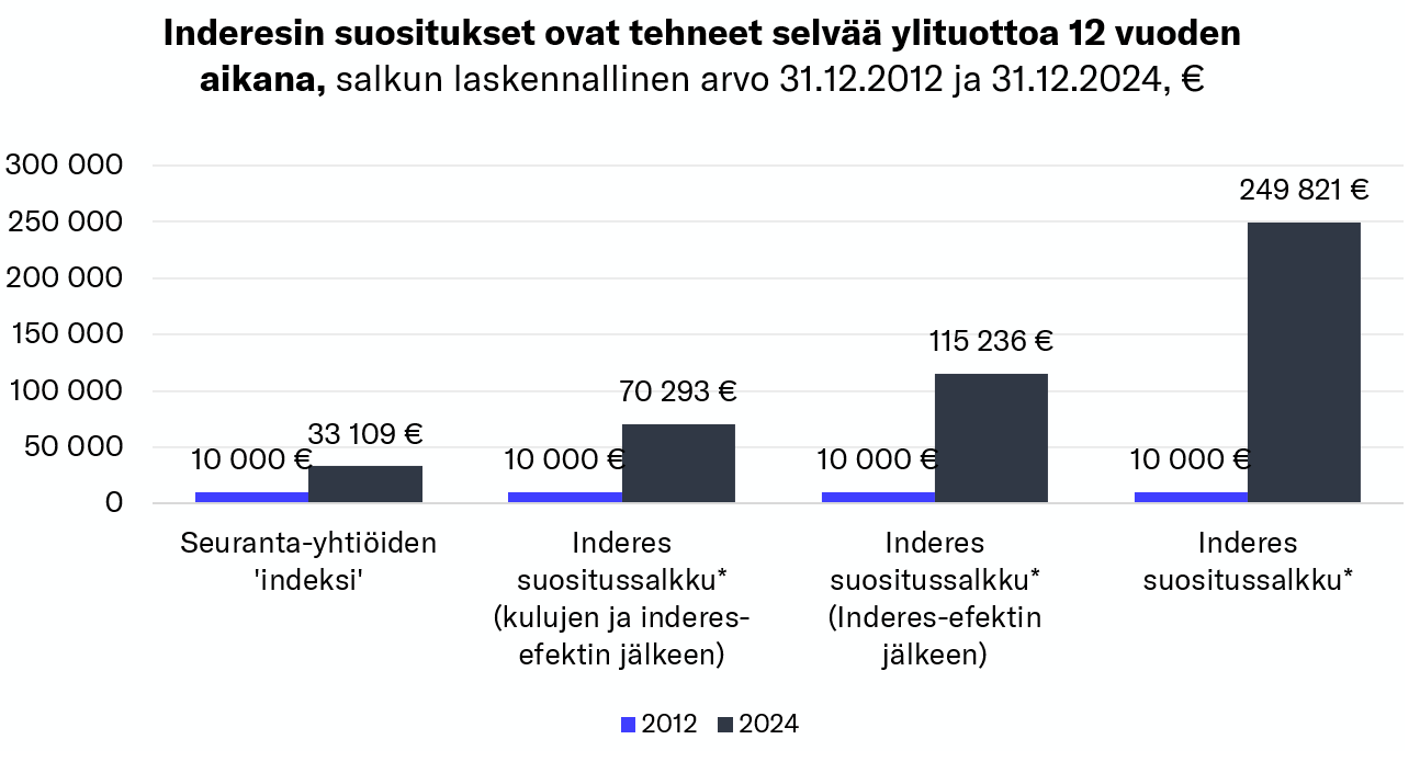 Ero tuotoissa konkretisoituu tarkastelemalla salkun arvonmuutosta. Pitkällä aikavälillä (2013–2024) 10 000 euron salkku olisi kasvanut Inderesin suosituksien mukaisella strategialla noin 250 000 euroon ja Inderes-efektin sekä kaupankäyntikulujen vähentämisen jälkeen 70 000 euroon, kun seurantayhtiöiden tasapainotetun indeksin omistaminen olisi nostanut salkun arvon ilman kuluja noin 33 000 euroon. Ero tuotoissa kasvaa 12 vuodessa noin 2–10 kertaiseksi Inderesin suositussalkkujen hyväksi.