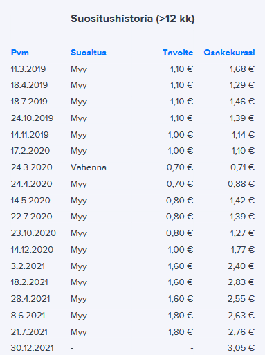 Tässä on se ongelma että suosituksia ei haluta flipfloppailla ihan joka rasahduksesta tai muuten olisi hikiset ja pitkät päivät toimistolla. Normaalisti joku olennainen muutos firman tilanteessa vasta triggeroi suosituksen päivityksen. Pelkkä kurssin laskettelu ei sitä tee. Fiksut osaavat itse laskea kuinka tuotto-odotus paranee kun kurssi laskee. Suositushintaa kyllä olisi päivitetty jos siihen olisi selvät perusteet. Pelkkä kurssilasku ei koskaan ole siihen syy. Ja siis Suositus (Lisää, Vähennä, Osta jne.) ei kohtaa päivityksiä puhtaasti vain koska kurssi on heilunut jos firman osalta mitään ei ole tapahtunut. Pitäisi olla joku merkittävä kurssin ylilyönti tai muu firmaan liittyvä uutinen että päivitystä napsuisi.