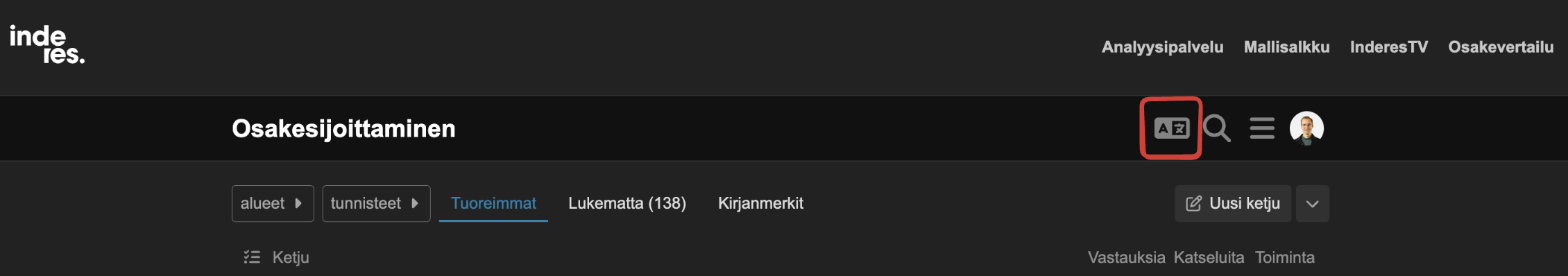 Olemme tuoneet Inderesin foorumille monikielisyystuen. Tämä tarkoittaa automaattista sisältöjen kääntämistä ja on osa Inderesin kansainvälistymistä. Jos jostain syystä näet nyt sisältöä väärällä kielellä, voit vaihtaa sisältökielen foorumin oikeasta yläkulmasta. Kieli tulee automaattisesti tilisi kielen perusteella tai anonyymeilla selaimen kielen mukaan.