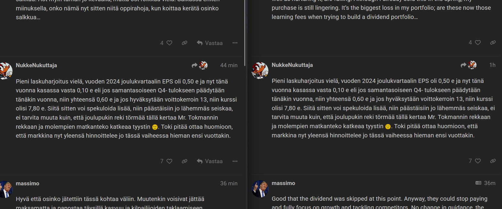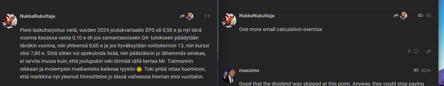 Kyseessähän ei ole oikeasti maata mullistava ominaisuus, mutta pienet yksityiskohdat (jotka ontuvat pahasti) ärsyttävät. Ja suurehkolla foorumin käytöllä, näitä pieniä ärsyttäviä yksityiskohtia näkee kokoajan = väkisinkin vaikuttaa mielekkyyteen selata meemuja ja lukea Nokian edesottamuksia. Ja tämä tulee siis HC_Inderes_fanboy#1:ltä (okei, ehkä @Sijoittaja-alokas jälkeen).