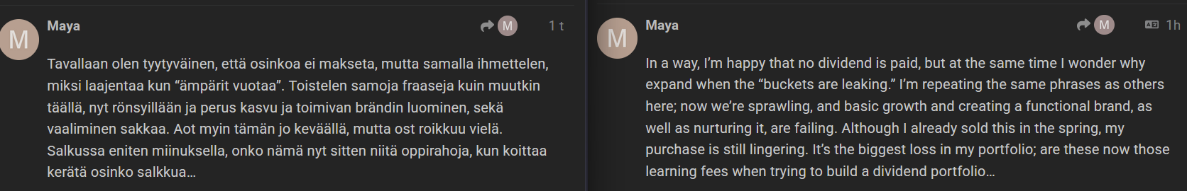 En ole jaksanut ottaa asiaan kantaa aiemmin, mutta kun sijoittamiseen keskittyvällä foorumilla käyttäjien viestien sijaan nykyään merkittävä osa sisällöstä on tekoälyroskaa, alkaa mitta täyttyä kovaa tahtia.