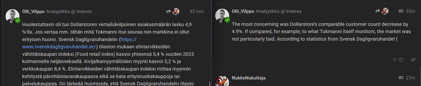 Ihan mielenkiinnosta (hyvien kommenttien jälkeen!) pitää kysyä, onko tämä kääntäjätyökalu jokatapauksessa jäävä ominaisuus, on yhteisö mitä mieltä tahansa? Vai onko jokin mittari, että kun tarpeeksi täällä valitetaan poistetaan kokeilu, ja palataan “vanhaan hyvään aikaan”? ![]()
