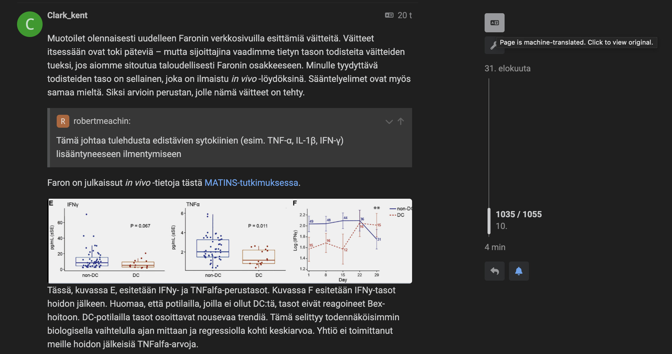 Kiitos palautteista, sori flunssa vähän hidastanut vastailua! Jostain syystä tuolla Faron-ketjussa oli muutama viesti katkennut käännöksissä, laitoin noi nyt uudestaan kääntymään. Tuo käännösjono on vähän tukossa meidän koko viestihistorian kanssa, mutta pitäisi helpottaa kun saamme sitä purettua!