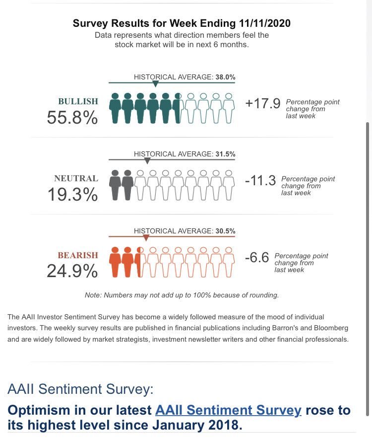 Mun mielestä sentimentti on korkealla, mutta ei ”äärimmäisen härkämäinen”, jos ollaan korkeimmalla tasolla sitten tammikuun 2018 (hyvä huomata että kysely tehtiin juuri kun pfizer kertoi uutiset viime viikolla):