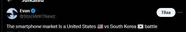 Luulin Samsungin osuutta pienemmäksi ja Applen osuutta isommaksi, lisäksi luulin, että muilla merkeillä olisi vähän isommat siivut eikä tuollaisia mitättömiä näkymättömiä siivuja. ![]()