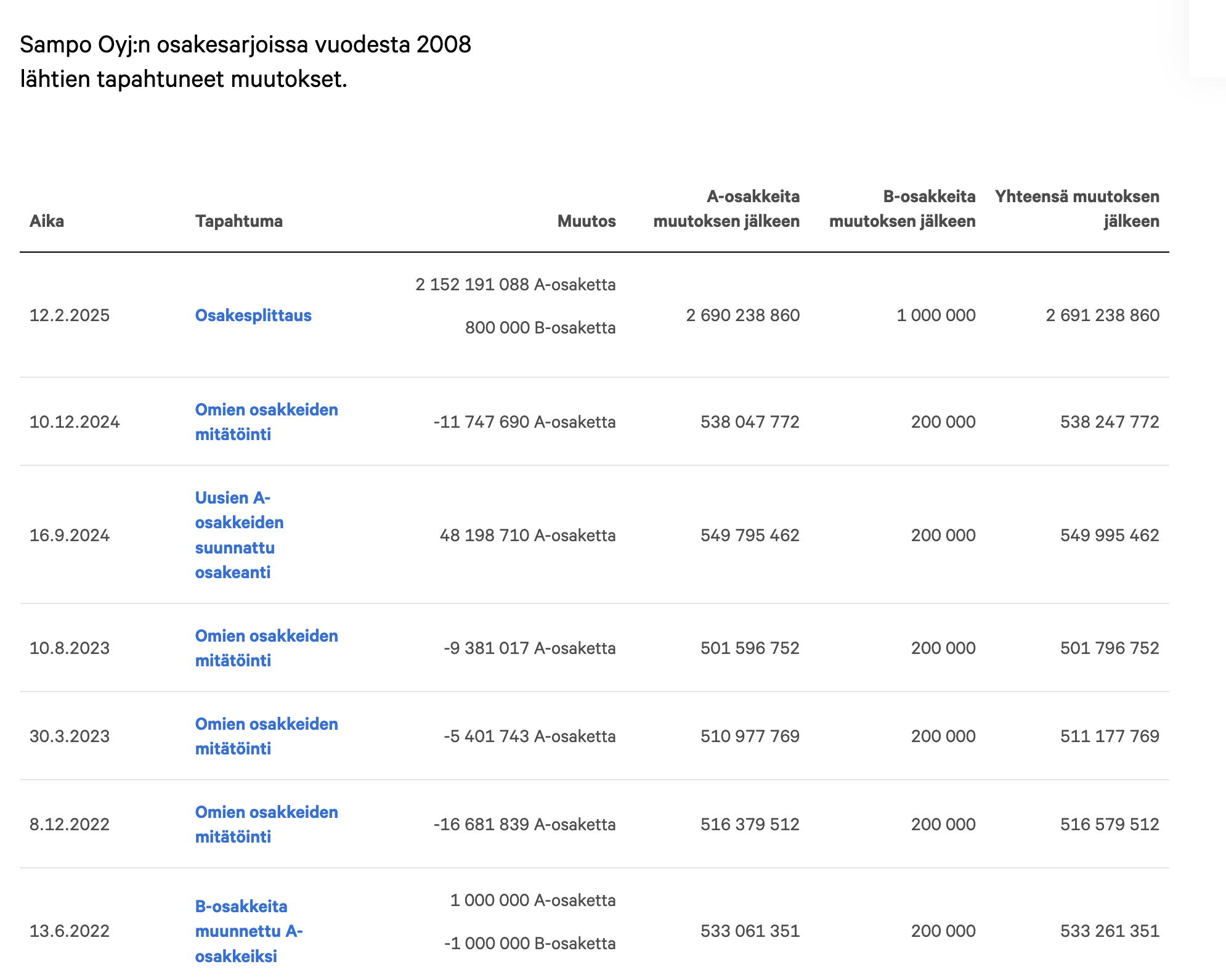 Hassuinta Sammon osakkeiden ostoissa on, että silti osake splitattiin ja nyt osakemäärä on suurempi, kuin ennen ostoja. Tästä haastattelija olisi voinut roastata kunnolla ja @Mirko_Sampo_IR selvittää asiaa perinpohjin.