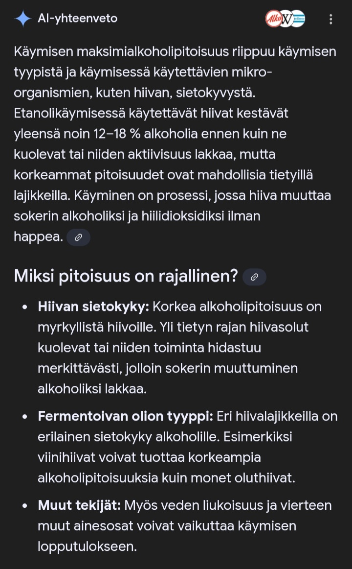 Olen aina käsittänyt että joku raja käymistuotteille. Onkohan se jotain 12-13 kuten viinit? Jotain munkkiluostari oluttakin on joka 11-12 tjstp.